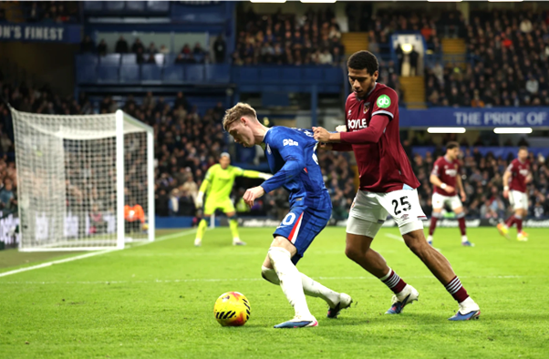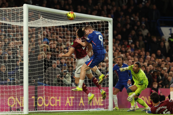 Ipswich Town reject LIAM DELAP, now #1 striker of CFC cannot score not even few feet away from empty goal despite that he made fault on WestHam defender Mavropanos (on the grass right) and with both hands on other WestHam defender Kilman. We were lucky that seconds further Cucurella's equalizer goal stands after VAR review (see top image).